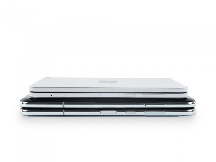 iFixit 表示,Surface Duo 的拆解过程并不顺利,由于双电池粘贴在背板上,因此基本上无法从机身背面打开。